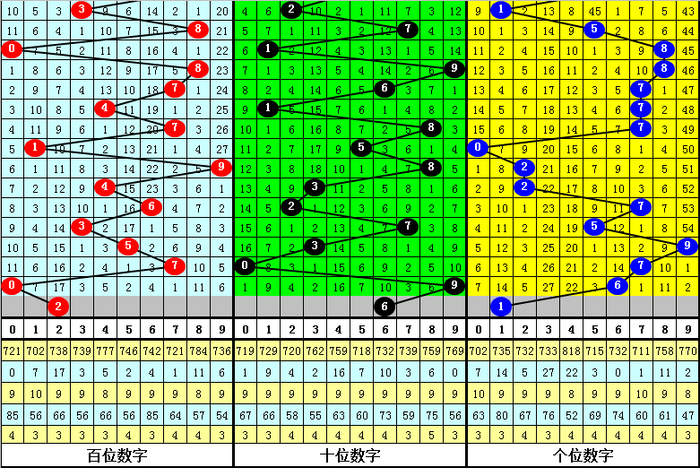 大中小分析:在组选0-9号码散布图中,前10期小 号(0-2区段)出现8枚奖号,中号(3-6区段)出现10枚奖号,大号(7-9区段)出现12枚奖号,上期大中小区间折柳出现1枚奖号,本期防大号转冷,预测7-9区段无号。