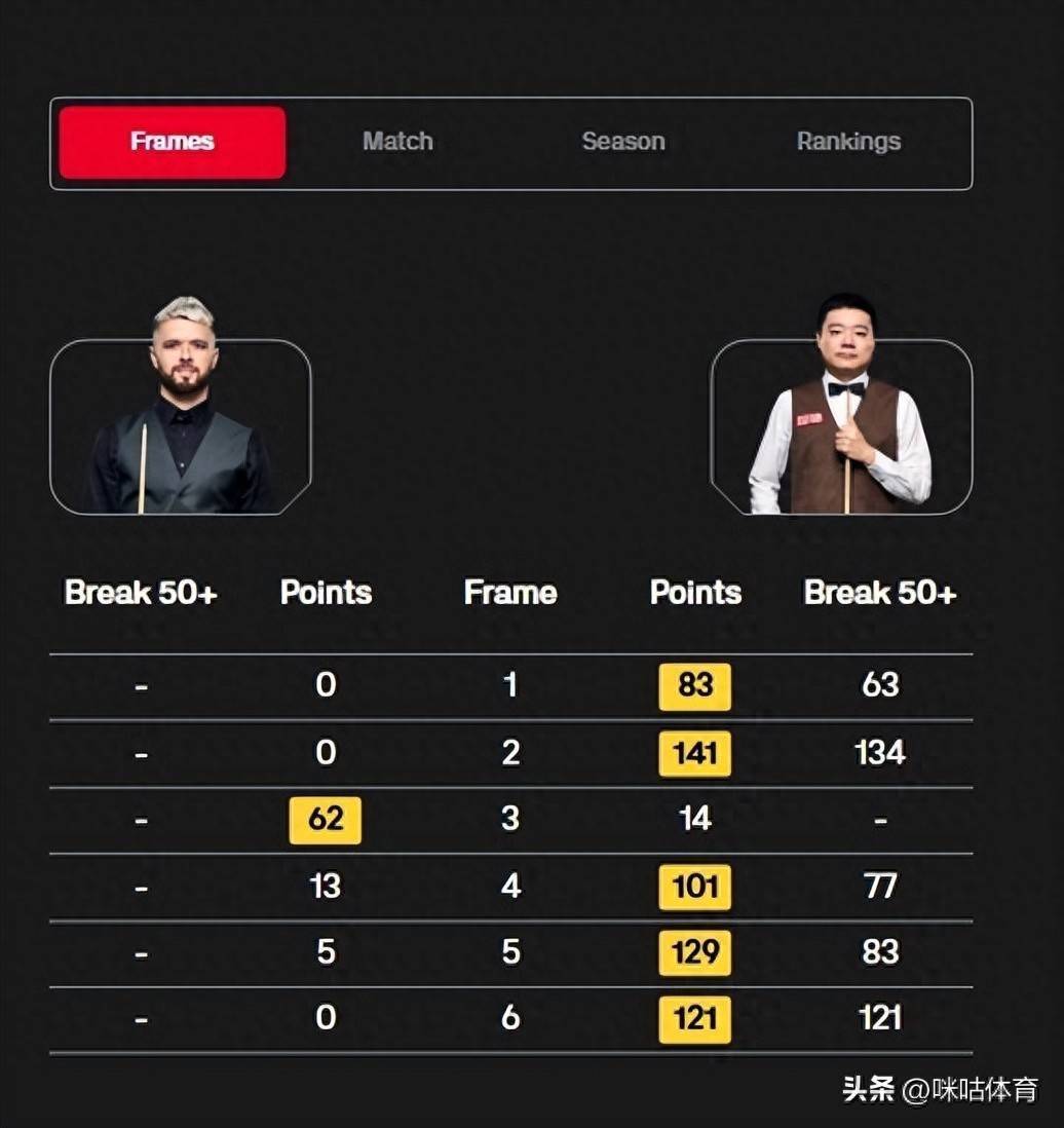 比赛中,丁俊晖进展杰出领略,在6局比赛中有5局完成了破50+,在终末一局中更是轰下了121分!